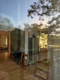 V obývací místnosti je možné sledovat přírodu a TV, ale nejhezčí program je k vidění v krbových kamnech :-)